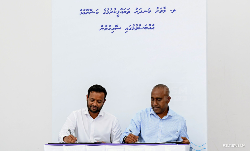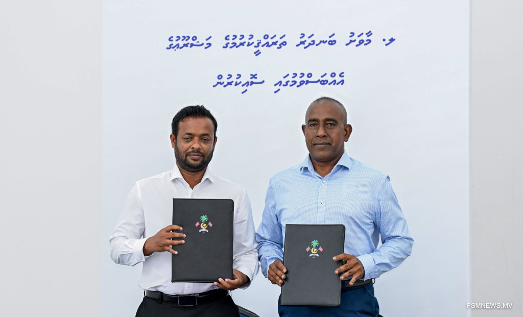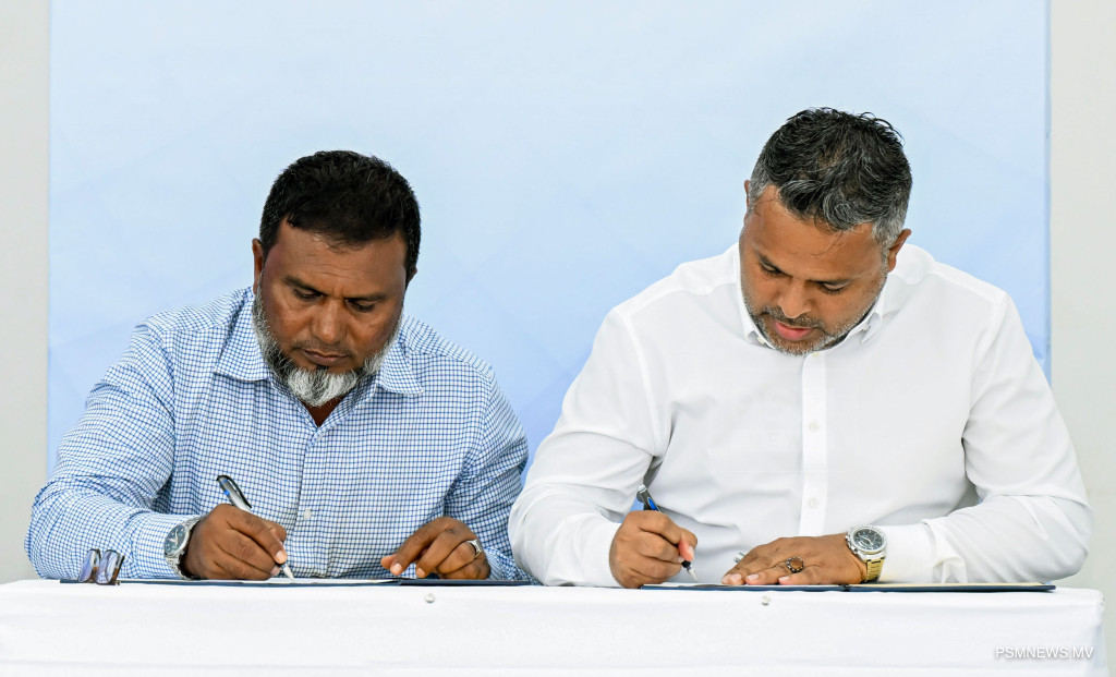 ލ. މާވަށު ބަނދަރު ތަރައްޤީކުރުމުގެ މަޝްރޫޢުގެ މަސައްކަތް ހަވާލުކުރުމުގެ އެއްބަސްވުމުގައި ގެދޮރުވެރިކަމާއި ބިނާރާ ބެހޭ ވަޒީރު ޑރ. ޢަބްދުﷲ މުއްޠަލިބު އަދި އެމްޓީސީސީގެ މެނޭޖިންގ ޑިރެކްޓަރ އަހްމަދު ސައުދީ ސޮއިކުރައްވަނީ / ފޮޓޯ - ރައީސް އޮފީސް