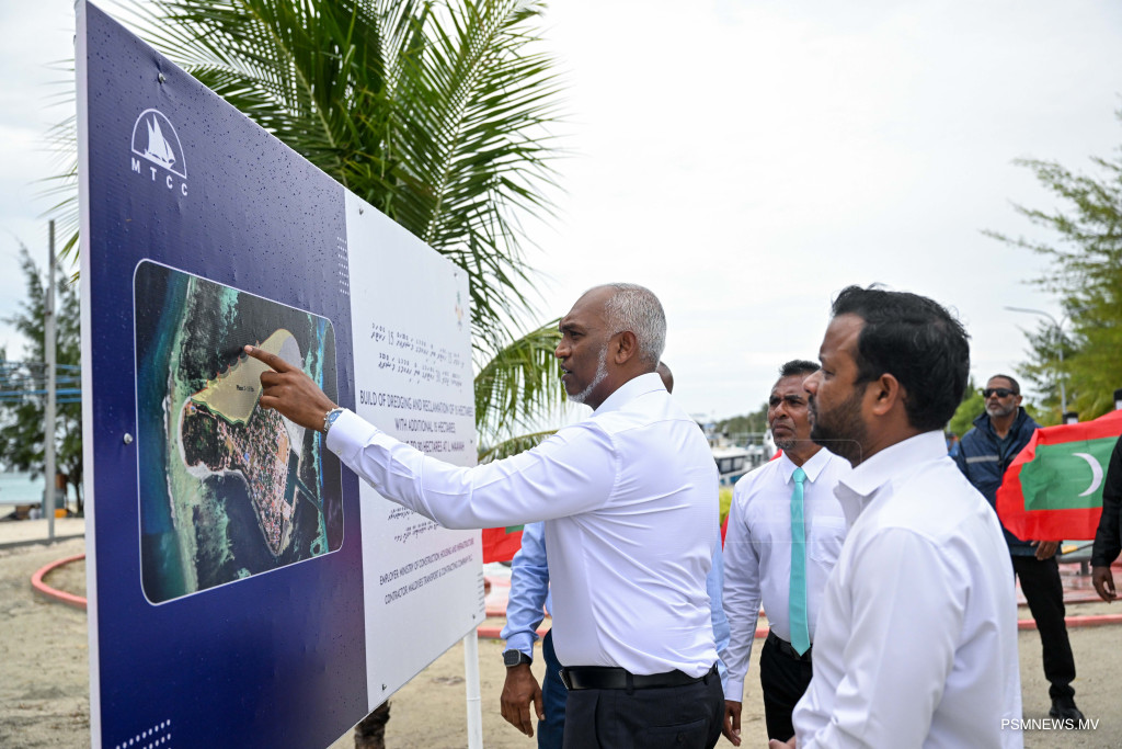 ލ. މާވަށު ބިން ހިއްކުމުގެ އަމަލީ މަސައްކަތް ފެށުމުގެ ރަސްމިއްޔާތުގައި ރައީސުލްޖުމްހޫރިއްޔާ ޑރ. މުޙައްމަދު މުޢިއްޒު ބައިވެރިވެވަޑައިގަންނަވަނީ / ފޮޓޯ - ރައީސް އޮފީސް