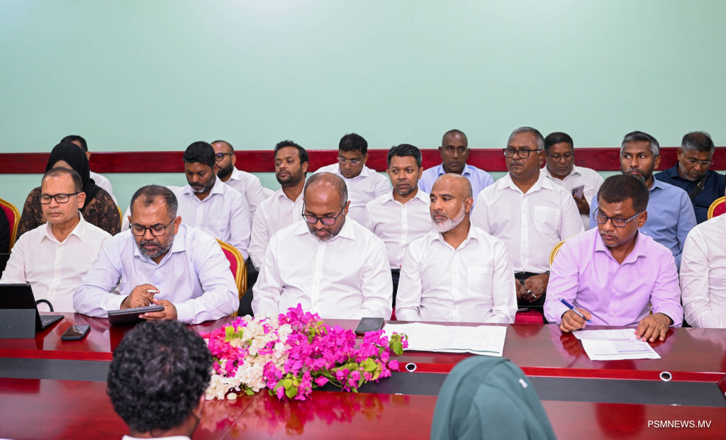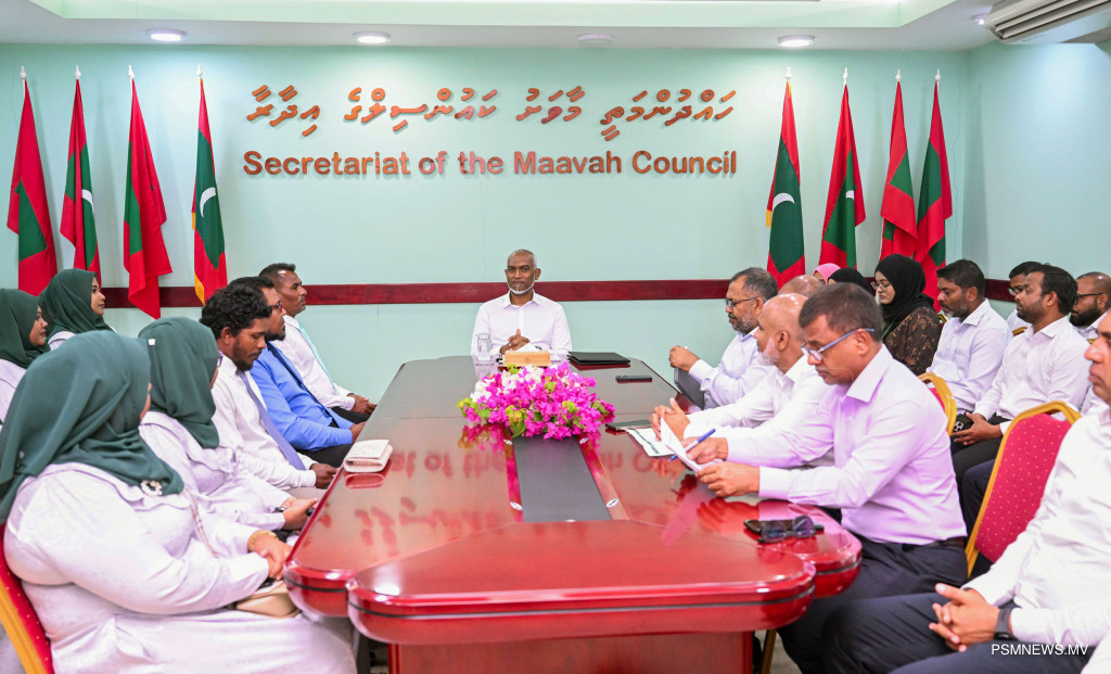 ރައީސުލްޖުމްހޫރިއްޔާ ޑރ. މުޙައްމަދު މުޢިއްޒު ލ. މާވަށު ކައުންސިލާއި، އ.ތ.މ ކޮމިޓީ އަދި ރަށުގެ މުއައްސަސާތަކުގެ އިސްވެރިންނާއި ބައްދަލުކުރެއްވުން / ފޮޓޯ - ރައީސް އޮފީސް