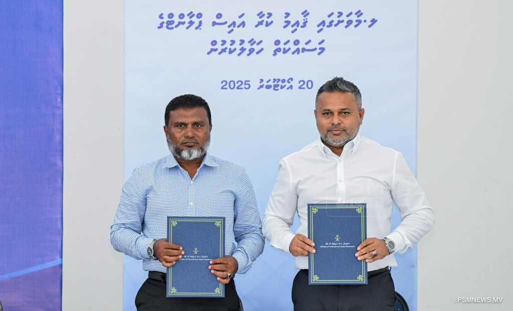 ލ. މާވަށުގައި ގާއިމްކުރާ އައިސް ޕްލާންޓްގެ މަސައްކަތް ހަވާލުކުރުމުގެ އެއްބަސްވުމުގައި މަސްވެރިކަމާއި ކަނޑުތަކާ ބެހޭ ވަޒީރު އަހުމަދު ޝިޔާމް އަދި މޯލްޑިވްސް އިންޑަސްޓްރިއަލް ފިޝަރީސް ކޮމްޕެނީ ލިމިޓެޑްގެ ޕްރޮޖެކްޓް ޔުނިޓްގެ މެނޭޖަރު މުހައްމަދު ޝަމީމް ސޮއިކުރެއްވަނީ / ފޮޓޯ - ރައީސް އޮފީސް