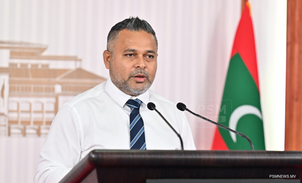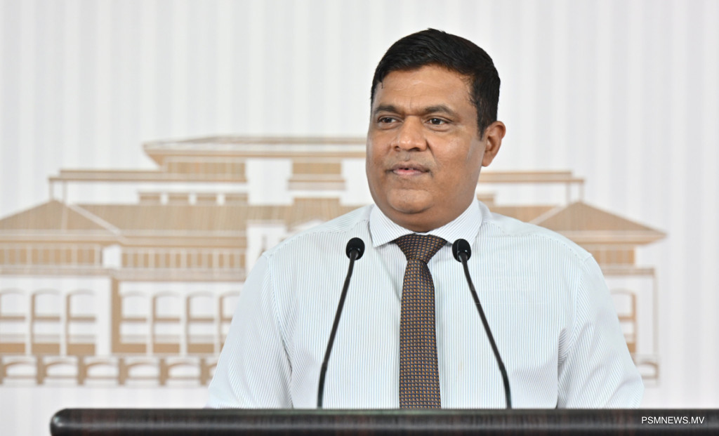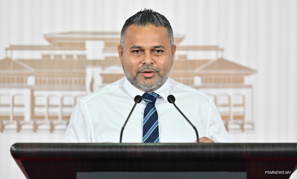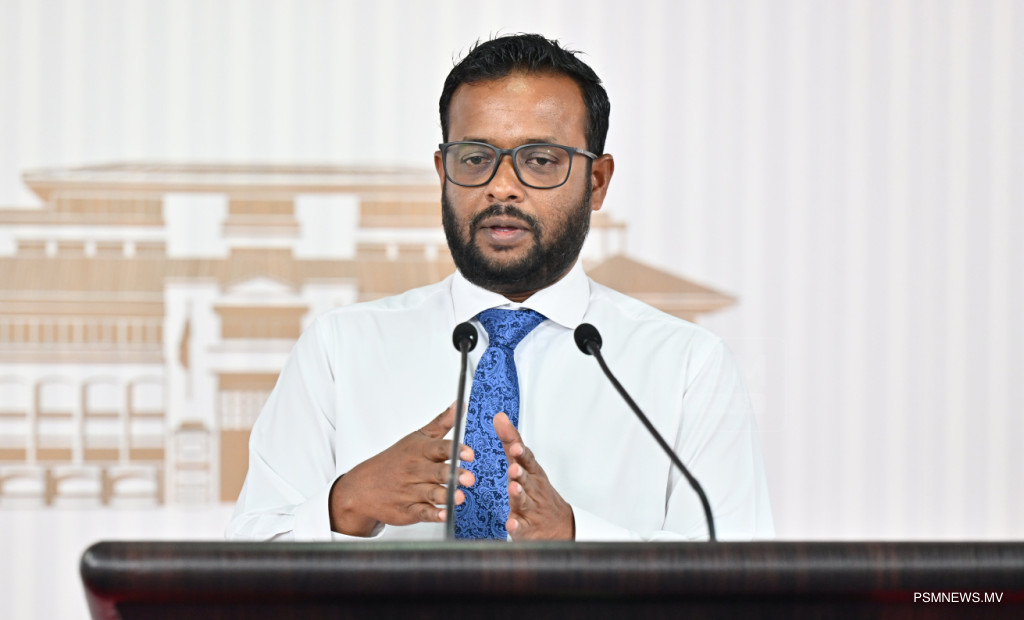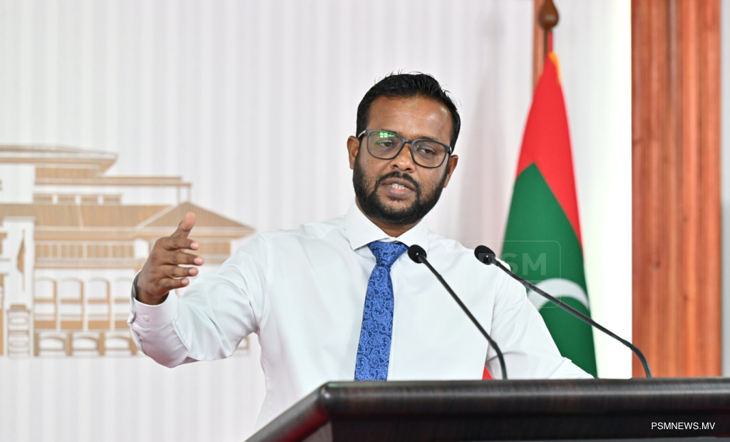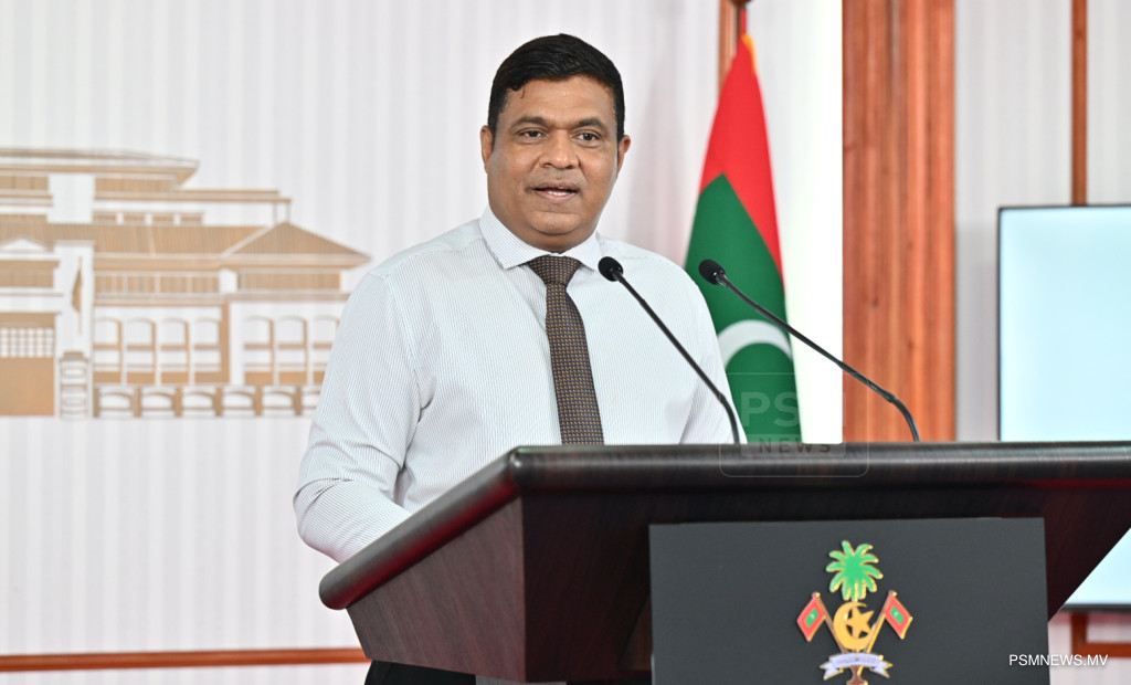 ރައީސުލްޖުމްހޫރިއްޔާގެ އޮފީހުގައި ބޭއްވި ނޫސްވެރިންގެ ބައްދަލުވުމުގައި މަސްވެރިކަމާއި ކަނޑުގެ ވަޞީލަތްތަކާ ބެހޭ ވަޒީރު އަޙްމަދު ޝިޔާމް ވާހަކަފުޅު ދައްކަވަނީ / ފޮޓޯ:: ރައީސް އޮފީސް